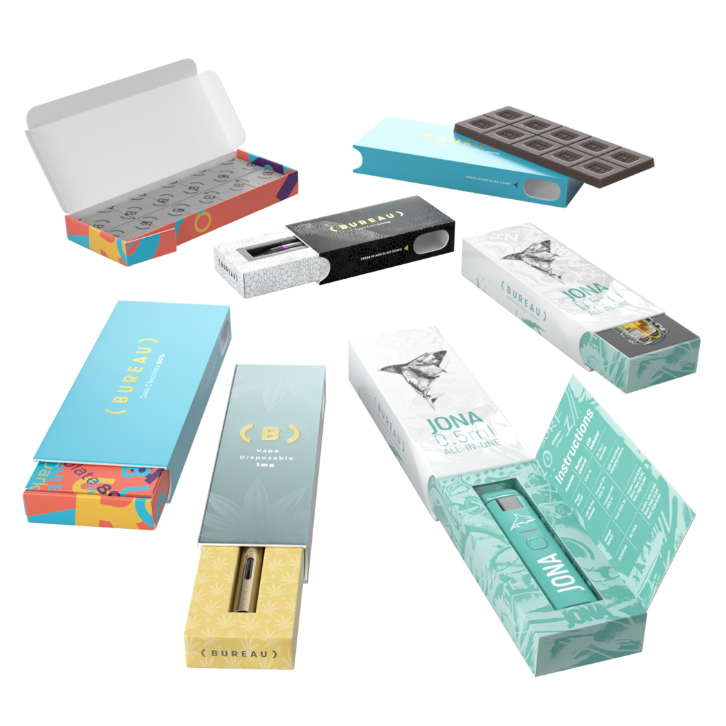 Minimalistic and eco-friendly, our all-paper CR Box is an effective way to store vape carts, disposable pens, starter kits, and candies. The box features capsule shaped paper “buttons” that must be pressed in and slid downwards to unlock the inner tray. These “buttons” are shaped to compliment the natural shape and movement of one’s fingers as they slide downwards. The outer box and inner tray are fully customizable with endless printing options: custom Pantones, foil stamping, spot UV, etc. The box size and product trays are also customizable to your exact specifications.