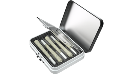 Our horizontally-oriented CR Hinged Tin is a slim and stylish option to store a multi-pack of pre-rolls. Custom inserts are available to fit your products perfectly; ideally suited to hold 5 half-gram pre-rolls or up to 10 dog walkers. The Child Resistant plastic button release provides a secure closure that is also simple to open without strain.